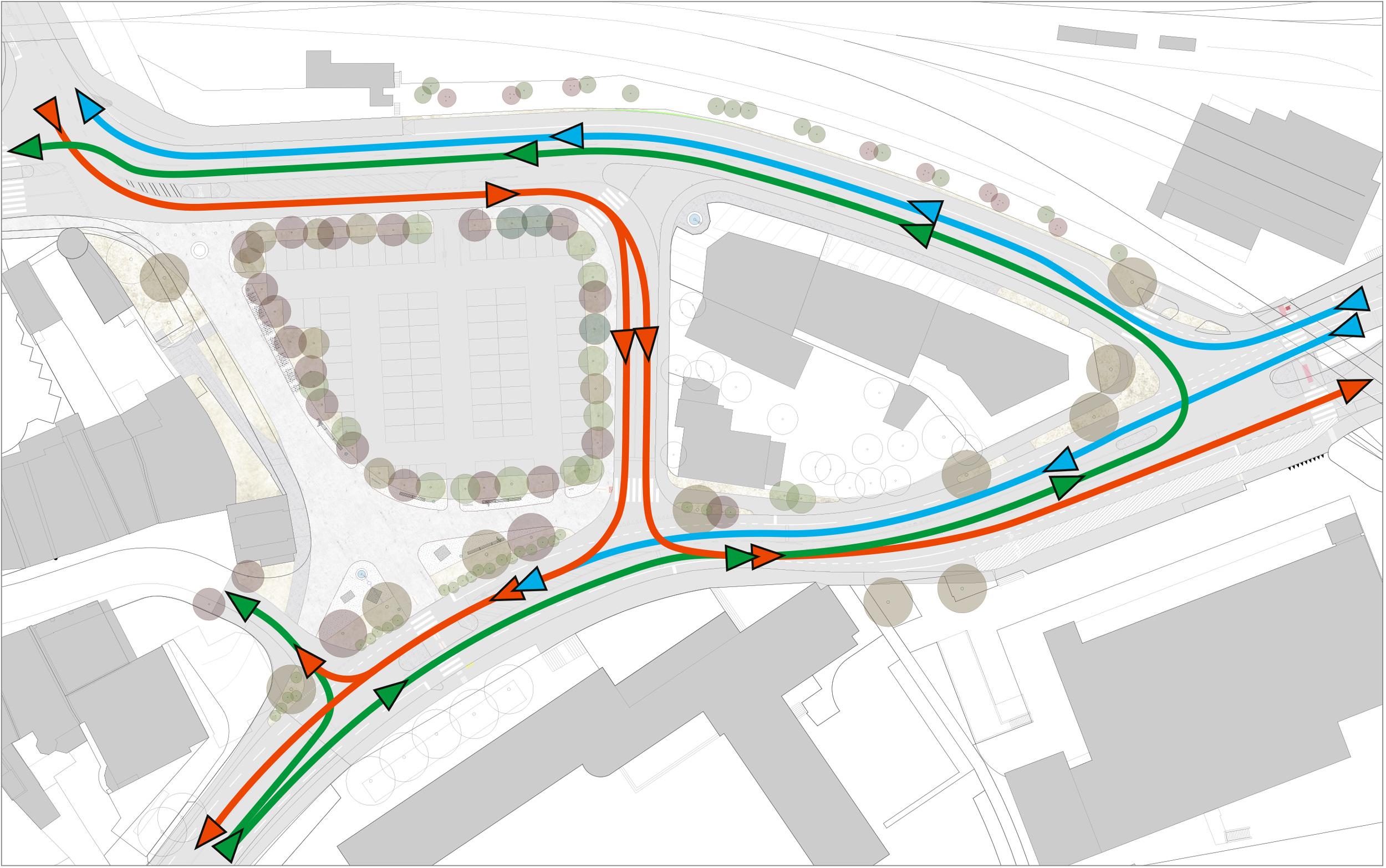 Mit den Aufwertungsmassnahmen ergibt sich die Gelegenheit, die Verkehrsabläufe effizienter zu organisieren. Der Verkehr fliesst künftig im Uhrzeigersinn um das Parkplatzareal. Damit wird der Verkehrsfluss optimiert und gleichzeitig die Sicherheit für den Fuss- und Veloverkehr erhöht.