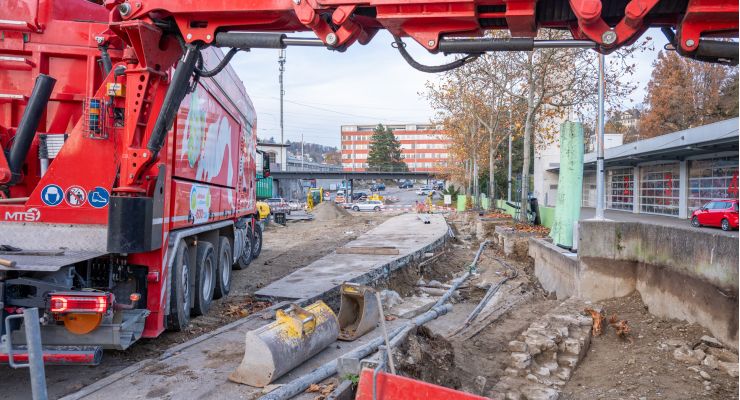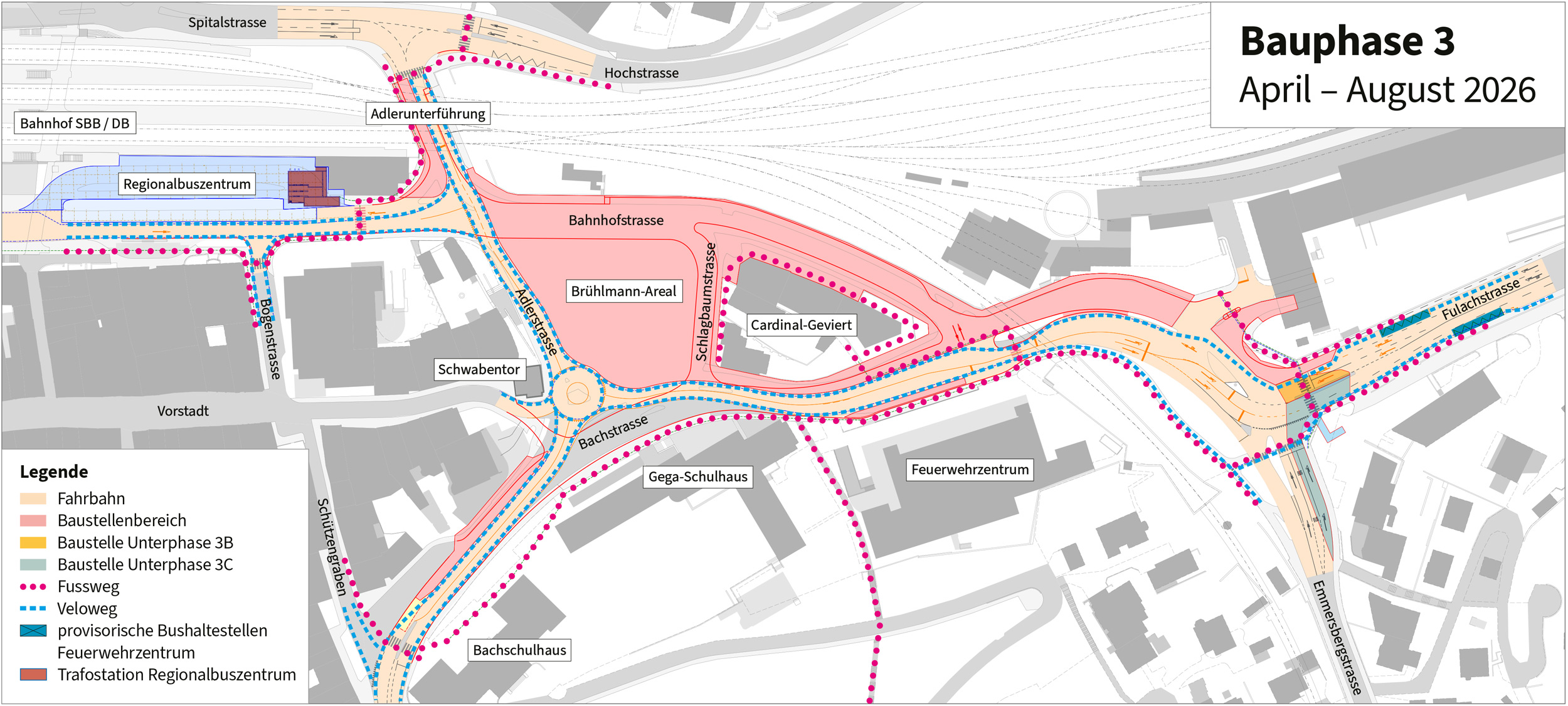 Die erste Bauphase startet am Montag, 11. August 2025 und dauert rund 6 Monate. Gebaut wird entlang der Bachstrasse vom Schützengraben bis zum Feuerwehrzentrum, entlang der Bahnhofstrasse vom Regionalbuszentrum bis zum Feuerwehrzentrum sowie im Bereich der Schlagbaumstrasse, die für den Verkehr gesperrt wird.