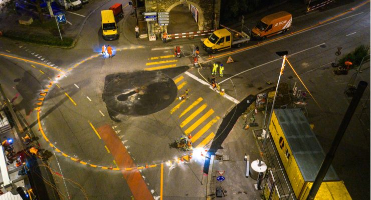 Beim Verkehrsknoten Schwabentor wird während der Bauzeit anstelle der Lichtsignalanlage ein Mini-Kreisel erstellt. Zur Erhöhung der Sicherheit gilt im ganzen Baustellenbereich Tempo 30.