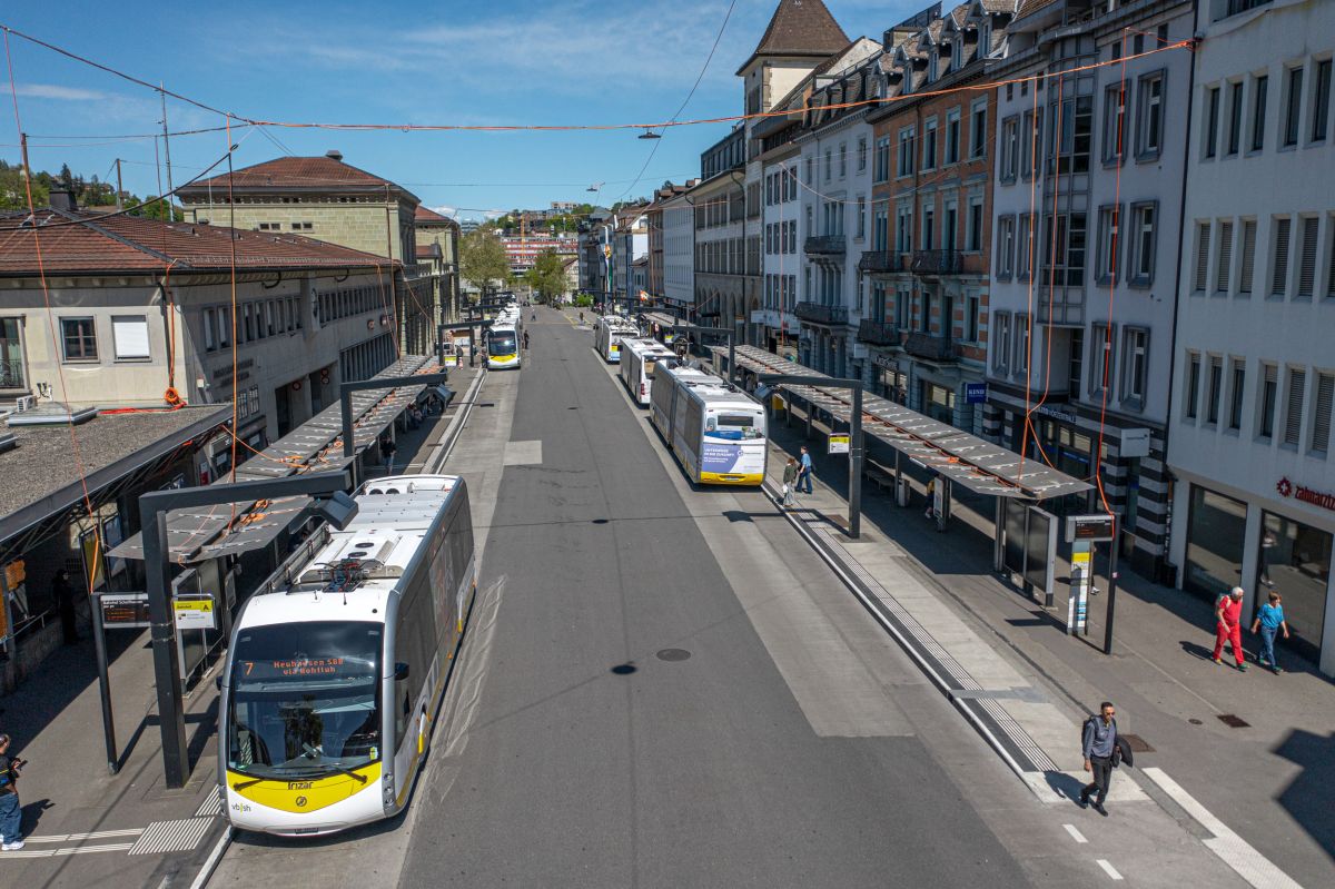 Bestandesaufnahme: So präsentierte sich die die Bahnhofstrasse seit dem Abschluss der ersten Etappe der Bauarbeiten im Sommer 2021. Im Zusammenhang mit der Einführung der Elektrobusse in den Jahren 2020/2021 wurden durch die vbsh und SH Power bereits neue Werkleitungen verlegt, bestehende Leitungen instandgesetzt und Ladearme für die Elektrobusse installiert.
