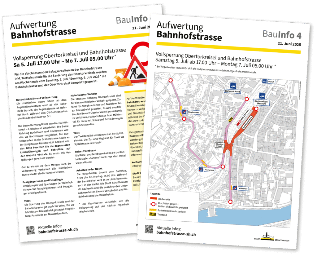 Auf der Projektwebsite www.bahnhofstrasse-sh.ch sind aktuelle Informationen sowie Übersichtspläne zum Busbetrieb und zum Verkehrsregime während der Vollsperrung publiziert.
